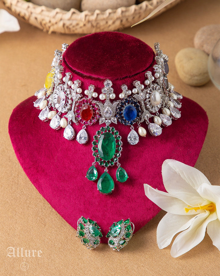 Chromé Royale brings together colour, craft, and high-polish detailing in a way that feels both statement-making and impeccably refined. The choker layers classic stones with multi-colour accents, each oval set into a structured frame that creates a rich, regal rhythm along the neckline. Pearl drops and teardrop crystals add movement, leading to the bold emerald pendant that serves as the piece’s striking focal point. Accompanied by intricately set earrings, the set holds its presence. Chromé Royale is designed to embrace vibrance with intention, a piece that balances artistry perfectly.