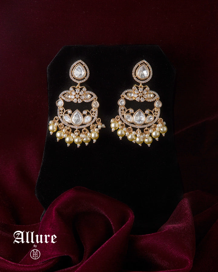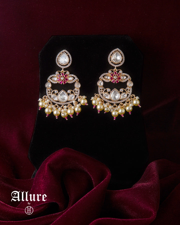 The Qamar Chandbali earrings feature an elegant crescent silhouette adorned with uncut Polki, ruby accents, and a luminous teardrop stud. Soft pearl drops add graceful movement, blending royal heritage with timeless feminine charm perfect for weddings and celebrations.