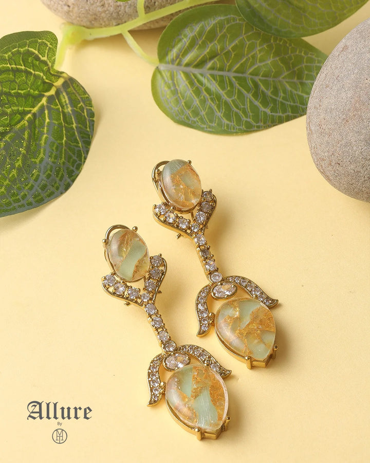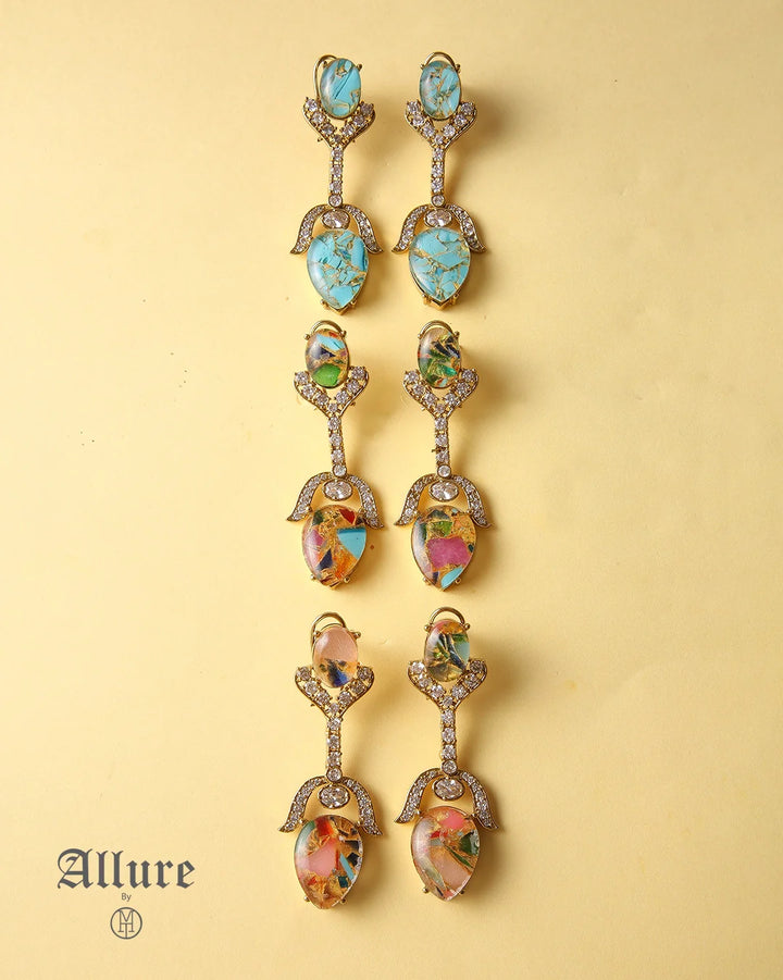 The Radiant Mirage captures the allure of real gemstones with plexi stones in Ferozi, green, and multi-shades. The vibrant blend of colors brings a modern twist to traditional design, evoking the richness of classic beauty with a contemporary edge. These earrings are designed to make a statement, offering a sophisticated touch to both casual and formal outfits. Their lightweight feel and stunning colors make them an essential piece for any jewelry collection, perfect for those who seek elegance with a bit of bold flair.