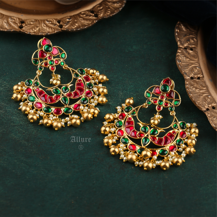 A regal gold chaandbaali with handset stones in shades of red and green finished with gold balls that add to its charm.