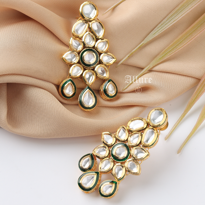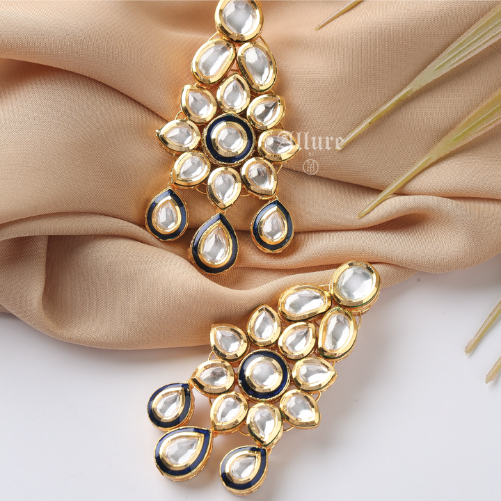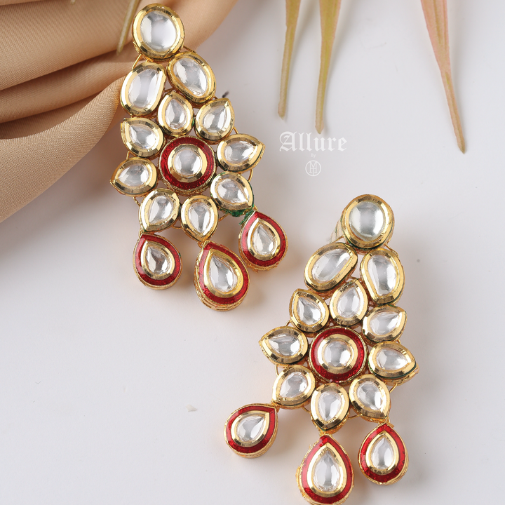 Our Riteeka kundan earrings feature an intricate design that is enhanced with enamel and teardrop hangings that add to its charisma
