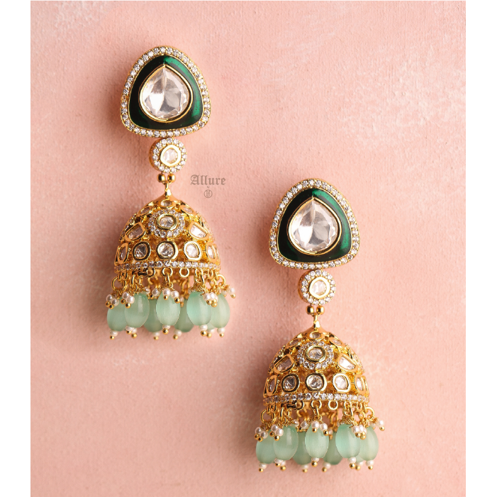 Saba Jhumki is a stunning Polki piece, elegantly adorned with enamel around the edges for an added touch of sophistication. Paired with a graceful jhumki featuring Polki and vibrant colored hangings, it exudes timeless charm, making it the perfect accessory for a regal and traditional look.