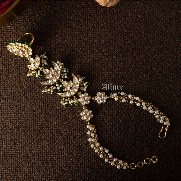 Unveil timeless elegance with Sahara, a regal hathphool designed to embody grace and sophistication. This exquisite piece features lustrous angoori pearls intertwined with intricately arranged polki elements, creating a dazzling symphony of tradition and glamour. The centerpiece—a radiant, meticulously crafted ring—adds a touch of opulence, completing the look with an air of majestic allure.   1. Due to the delicate nature of our jewelry, we regretfully cannot accept returns or exchanges. 2. Meticulously crafted using high-quality alloy, adorned with radiant gold/rhodium plating. 3. To maintain its allure, kindly refrain from contact with perfume or water. 4. Handle with care to keep your jewelry looking flawless over time. 5. Crafted to replicate the charm of fine jewelry without the high cost. 6. Created to be gentle on sensitive skin, offering both style and comfort. 7. Store in provided pouch or box to prevent damage and tangling. 8. Store in an airtight container to protect against tarnishing. |