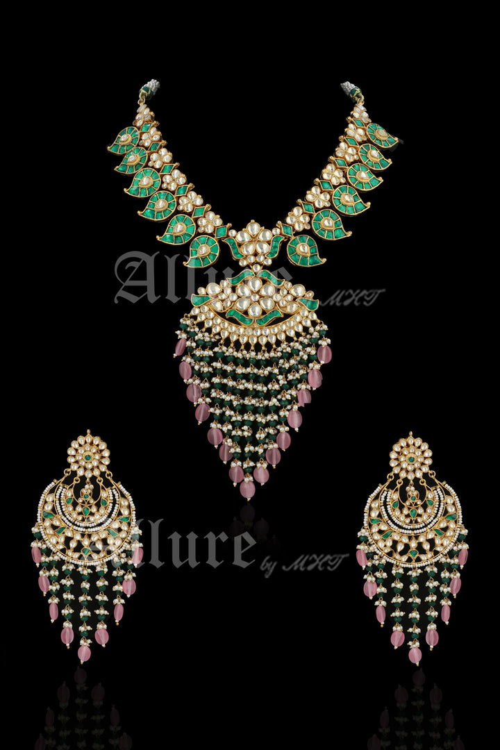 Perfect to amp up your wardrobe, the Sanober set features a breathatking maala with polki and handset stones. Finished with beads that cascade like a waterfall, the set is a statement. Paired with our hotseller chandbaalis, the set is a must have.