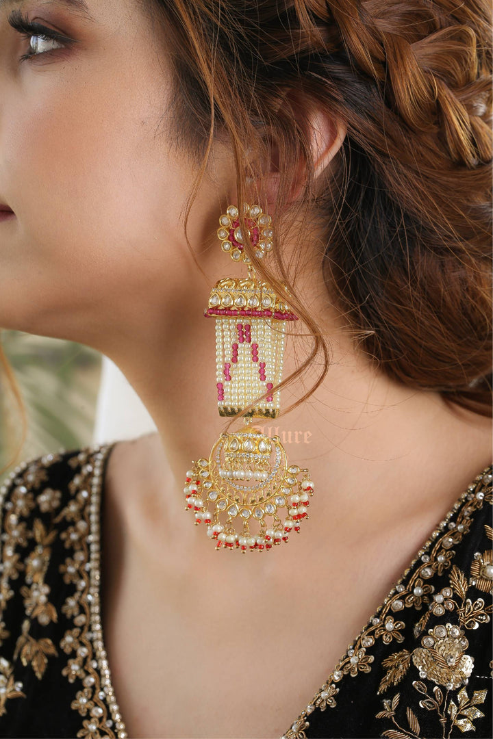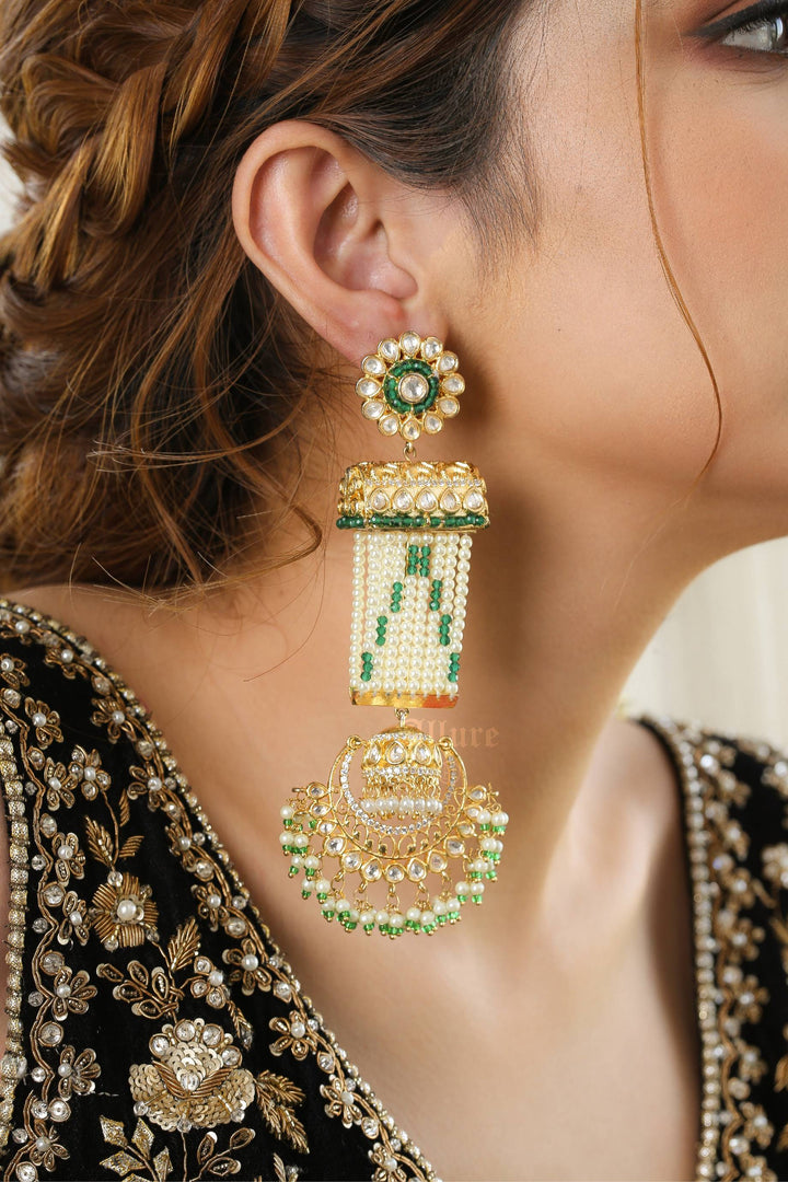 An ethnic affair, Shabana Jhumki features intricate setting of stones and polki with pearls and a hanging chaandbaali that completes the look.
