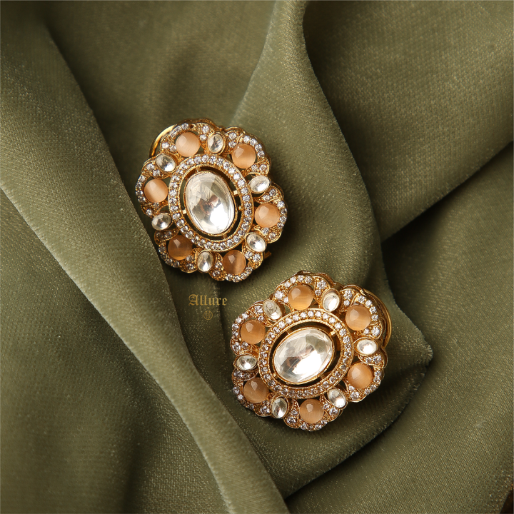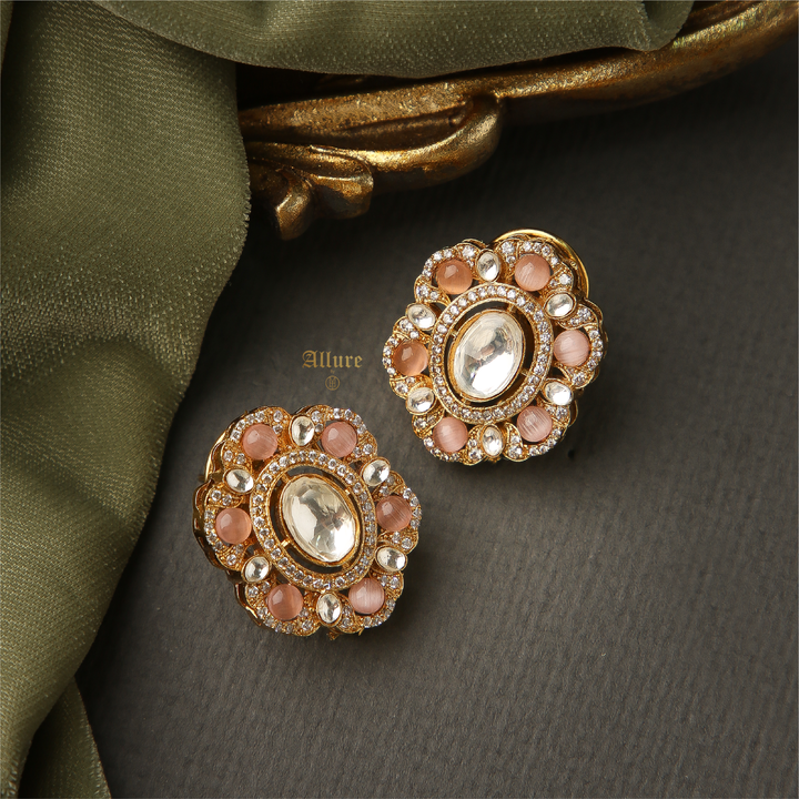 A polki earring center with Zirconia around the edges paired with colored stones and intricate polki setting to add to your oomph factor.