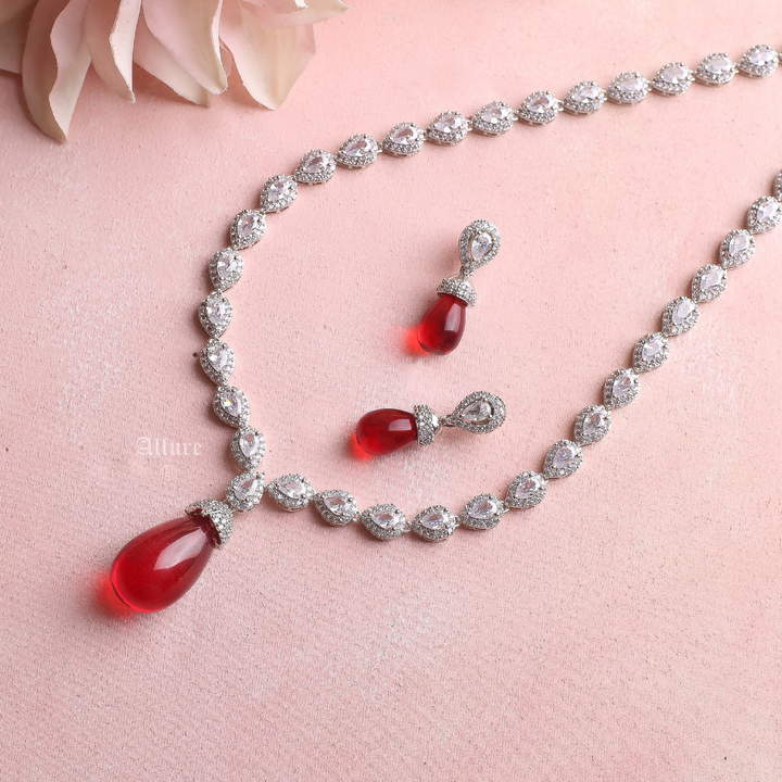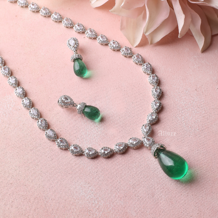 A regal Zirconia set with a tear shaped stone paired with matching earrings.