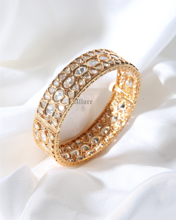 Sitaar karaa is a masterpiece that evokes old-world charm with a touch of grandeur. Its wide silhouette is adorned with intricate kundan-style stonework, echoing the brilliance of starlit skies. Delicately detailed and flawlessly symmetrical, this bangle adds regal elegance to any traditional ensemble.   1. Due to the delicate nature of our jewelry, we regretfully cannot accept returns or exchanges. 2. Meticulously crafted using high-quality alloy, adorned with radiant gold/rhodium plating. 3. To maintain its allure, kindly refrain from contact with perfume or water. 4. Handle with care to keep your jewelry looking flawless over time. 5. Crafted to replicate the charm of fine jewelry without the high cost. 6. Created to be gentle on sensitive skin, offering both style and comfort. 7. Store in provided pouch or box to prevent damage and tangling. 8. Store in an airtight container to protect against tarnishing. |
