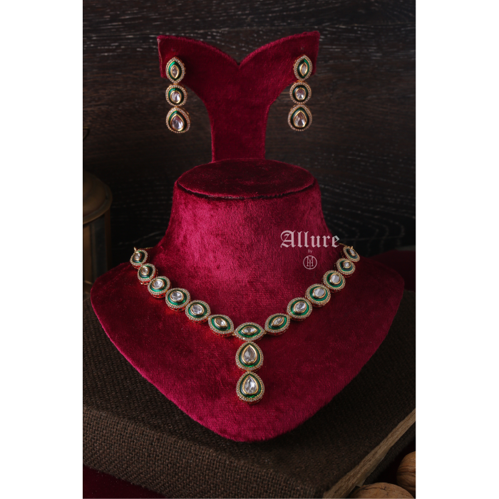 Sobia, a regal polki set that blends timeless charm with artistic finesse. Adorned with intricate enamel (meenakari) detailing, each piece is meticulously linked to form a graceful necklace, crowned with a stunning hanging pendant.    1. Due to the delicate nature of our jewelry, we regretfully cannot accept returns or exchanges. 2. Meticulously crafted using high-quality alloy, adorned with radiant gold/rhodium plating. 3. To maintain its allure, kindly refrain from contact with perfume or water. 4. Handle with care to keep your jewelry looking flawless over time. 5. Crafted to replicate the charm of fine jewelry without the high cost. 6. Created to be gentle on sensitive skin, offering both style and comfort. 7. Store in provided pouch or box to prevent damage and tangling. 8. Store in an airtight container to protect against tarnishing. |