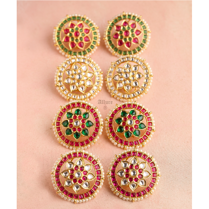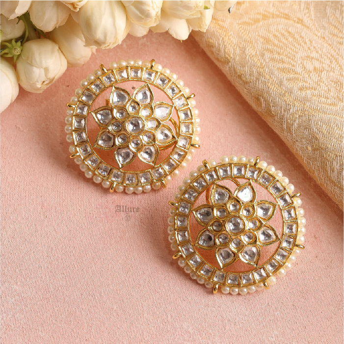 Sohni, an elegant round Polki stud designed for timeless charm. Featuring a delicate Angoori Pearl rim, the stud showcases a stunning floral pattern handset with vibrant colored stones and Polki. This exclusive piece radiates an ethereal beauty, perfect for those seeking a blend of tradition and modern sophistication   1. Due to the delicate nature of our jewelry, we regretfully cannot accept returns or exchanges. 2. Meticulously crafted using high-quality alloy, adorned with radiant gold/rhodium plating. 3. To maintain its allure, kindly refrain from contact with perfume or water. 4. Handle with care to keep your jewelry looking flawless over time. 5. Crafted to replicate the charm of fine jewelry without the high cost. 6. Created to be gentle on sensitive skin, offering both style and comfort. 7. Store in provided pouch or box to prevent damage and tangling. 8. Store in an airtight container to protect against tarnishing |