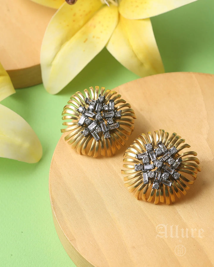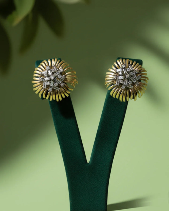 Aurelia Blossom captures the grace of a flower gilded by sunlight. Each petal is carved in a soft dome of brushed gold, fanning out around a pav?©-set crystal cluster at the centre. The petals‚Äô gentle curves and their rippling surface create a lifelike play of light, making the earrings appear as though they are in bloom. It‚Äôs a piece that bridges nature-inspired artistry with timeless golden glamour.