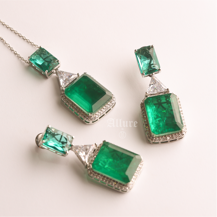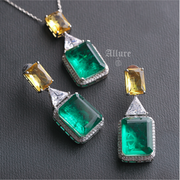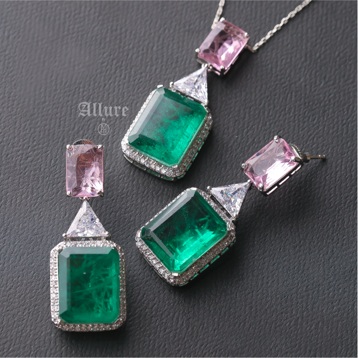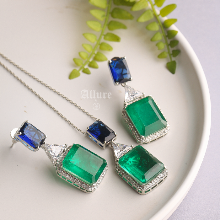 Experience the allure of Sparkle earrings, featuring rich-colored jade set with depth and intricacy. The elegant chain and pendant boast contrasting stones, perfectly complemented by matching earrings.