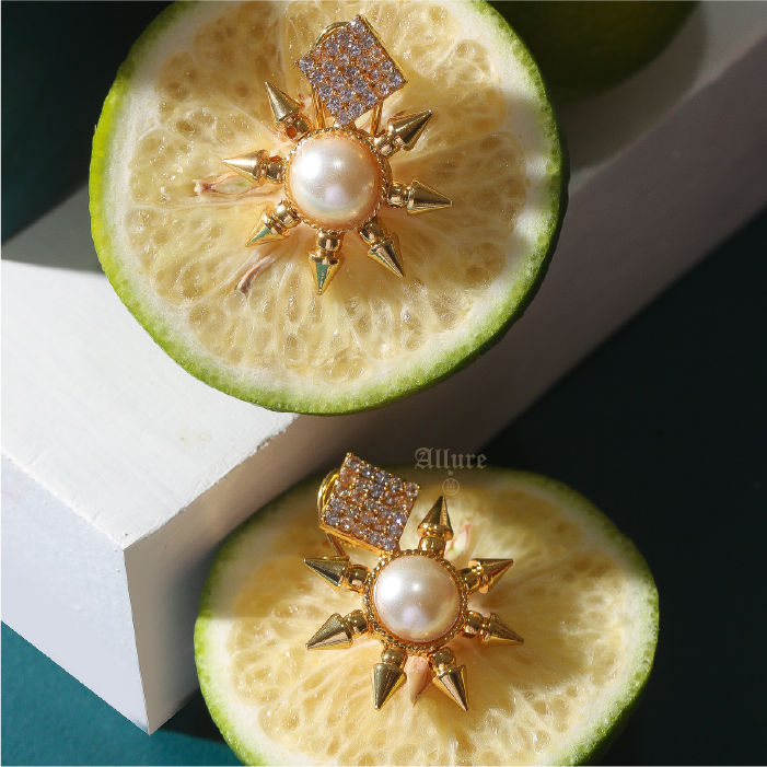 Starlight earrings, crafted to captivate. Featuring a triangular top adorned with handset zirconia, these earrings exude brilliance and sophistication. At the heart lies a lustrous faux pearl, radiating timeless charm, while the edgy bullet details around the edges add a modern twist to the classic design.
