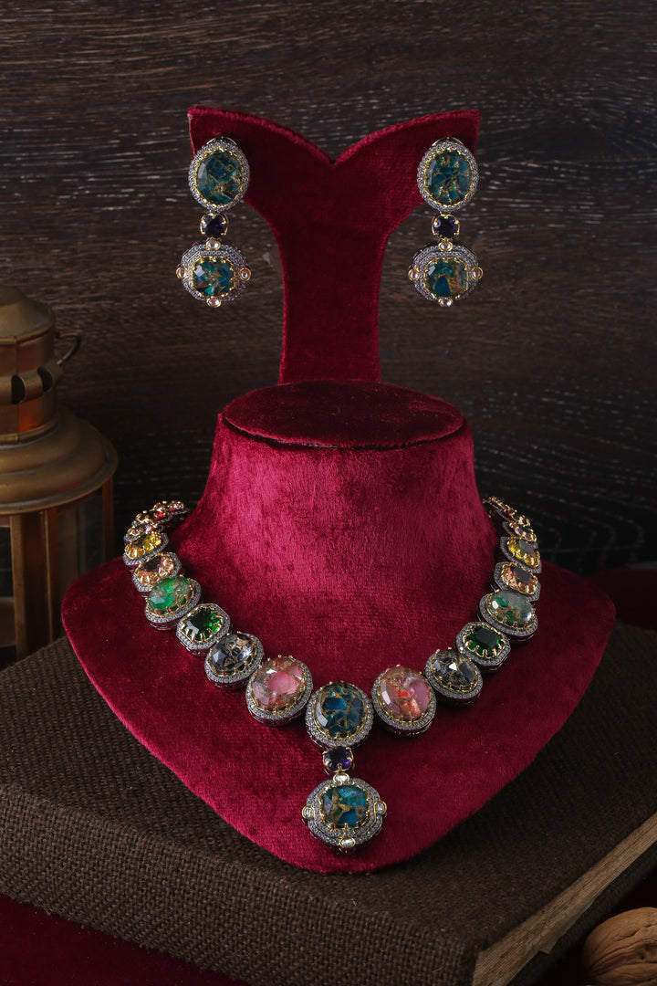 Step into the spotlight with Tajwar, a jewelry set that exudes unmatched grandeur and charm. Designed to add a touch of regal sophistication to your festive ensembles, this breathtaking set features a metallic finish adorned with vibrant crystal jades in captivating hues. Each piece is thoughtfully crafted to create a timeless allure, ensuring you dazzle with every glance. Paired with delicately crafted, dainty dangling earrings to complete the look.   1. Due to the delicate nature of our jewelry, we regretfully cannot accept returns or exchanges. 2. Meticulously crafted using high-quality alloy, adorned with radiant gold/rhodium plating. 3. To maintain its allure, kindly refrain from contact with perfume or water. 4. Handle with care to keep your jewelry looking flawless over time. 5. Crafted to replicate the charm of fine jewelry without the high cost. 6. Created to be gentle on sensitive skin, offering both style and comfort. 7. Store in provided pouch or box to prevent damage and tangling. 8. Store in an airtight container to protect against tarnishing. |