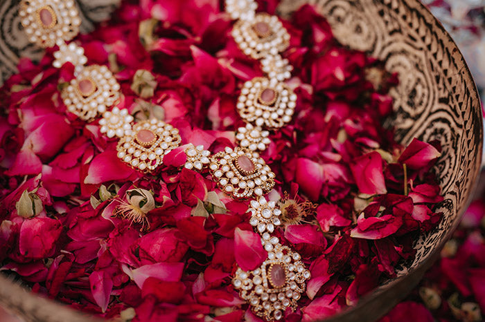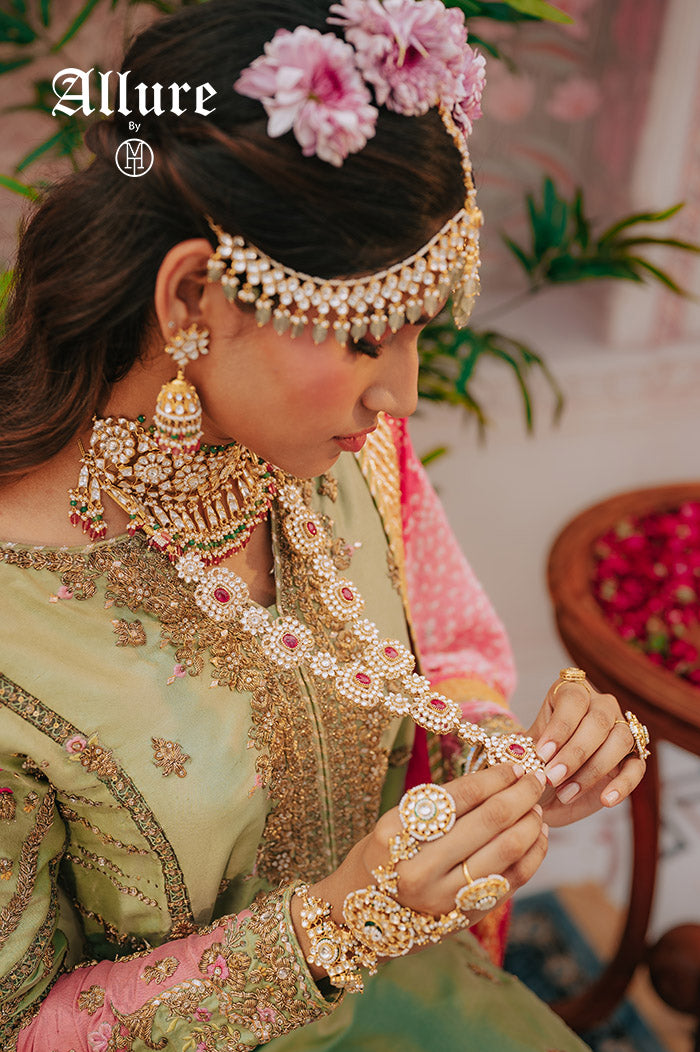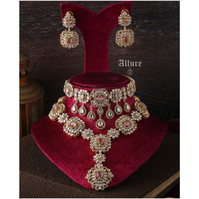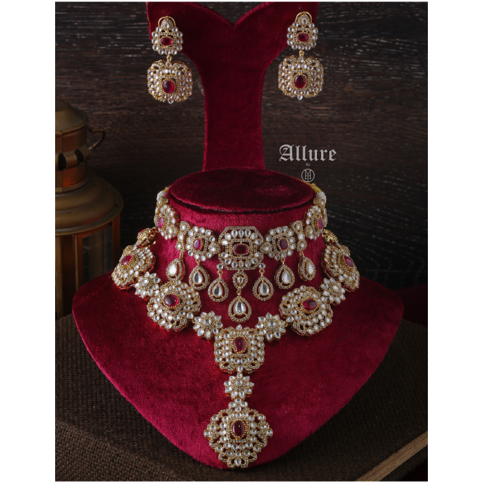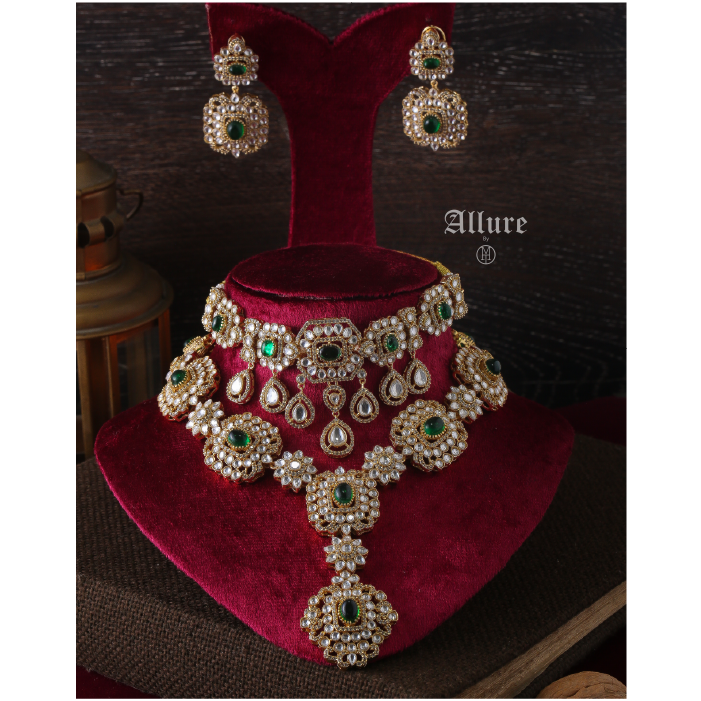 Tarana, a jewelry set designed for modern royalty. Inspired by Victorian Polki artistry, the centerpiece of this set is a resplendent choker adorned with intricately arranged Polki stones and vibrant colored jades that infuse a delightful pop of color. The choker is elegantly accented with teardrop Polki hangings, exuding opulence with every movement.   1. Due to the delicate nature of our jewelry, we regretfully cannot accept returns or exchanges. 2. Meticulously crafted using high-quality alloy, adorned with radiant gold/rhodium plating. 3. To maintain its allure, kindly refrain from contact with perfume or water. 4. Handle with care to keep your jewelry looking flawless over time. 5. Crafted to replicate the charm of fine jewelry without the high cost. 6. Created to be gentle on sensitive skin, offering both style and comfort. 7. Store in provided pouch or box to prevent damage and tangling. 8. Store in an airtight container to protect against tarnishing.   |