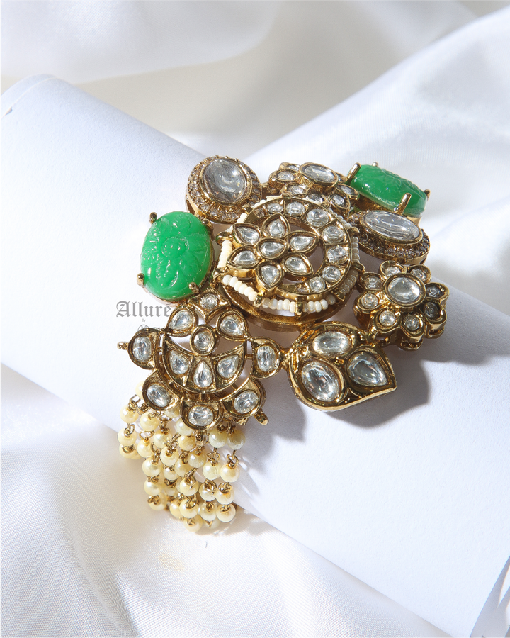 Tarang bracelet is a celebration of regal charm and cultural richness. This adjustable bangle from our Heritage range is a visual symphony of kundan embellishments, ruby-carved accents, and intricate motifs set in antique gold tones. Finished with delicate pearl tassels, it evokes the grandeur of heirloom treasures passed down generation   1. Due to the delicate nature of our jewelry, we regretfully cannot accept returns or exchanges. 2. Meticulously crafted using high-quality alloy, adorned with radiant gold/rhodium plating. 3. To maintain its allure, kindly refrain from contact with perfume or water. 4. Handle with care to keep your jewelry looking flawless over time. 5. Crafted to replicate the charm of fine jewelry without the high cost. 6. Created to be gentle on sensitive skin, offering both style and comfort. 7. Store in provided pouch or box to prevent damage and tangling. 8. Store in an airtight container to protect against tarnishing. |