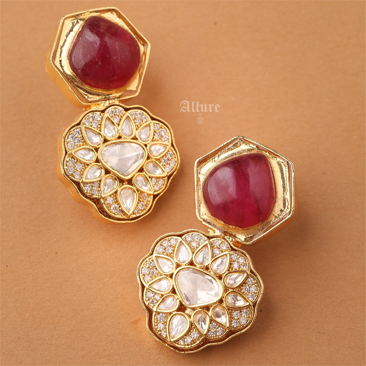 A gold top with a round glamorous stone that looks ethereal paired with a gold bottom with intricate craftmanship that increases its charm.