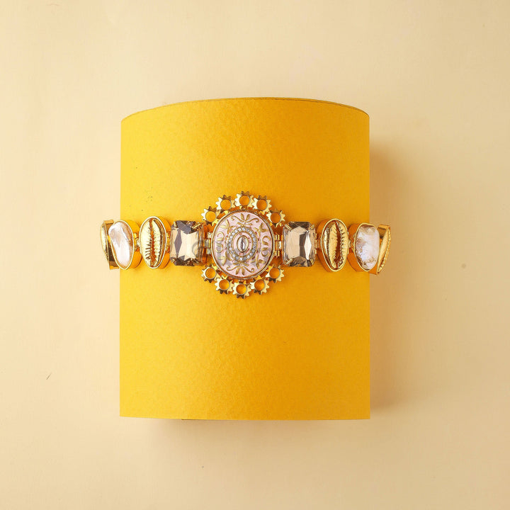 A luxe choker with an enamel center with an intricate gold setting. Featuring jades, sea shells and pearls to complete the look, the set is a keeper.