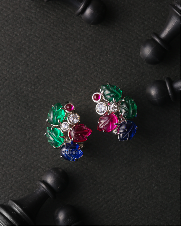 A statement of refined luxury, V?©da earrings exude an air of regal sophistication. Crafted with precision, these stunning earrings feature intricately set colored jades in striking, sculptural forms that captivate at first glance. The rich hues of jade evoke an aura of opulence, while meticulously placed white zirconia accents add a dazzling contrast, enhancing their luminous charm. Designed for those with a taste for exclusivity, V?©da blends classic grandeur with modern artistry, making it the perfect companion for lavish evenings and unforgettable moments.