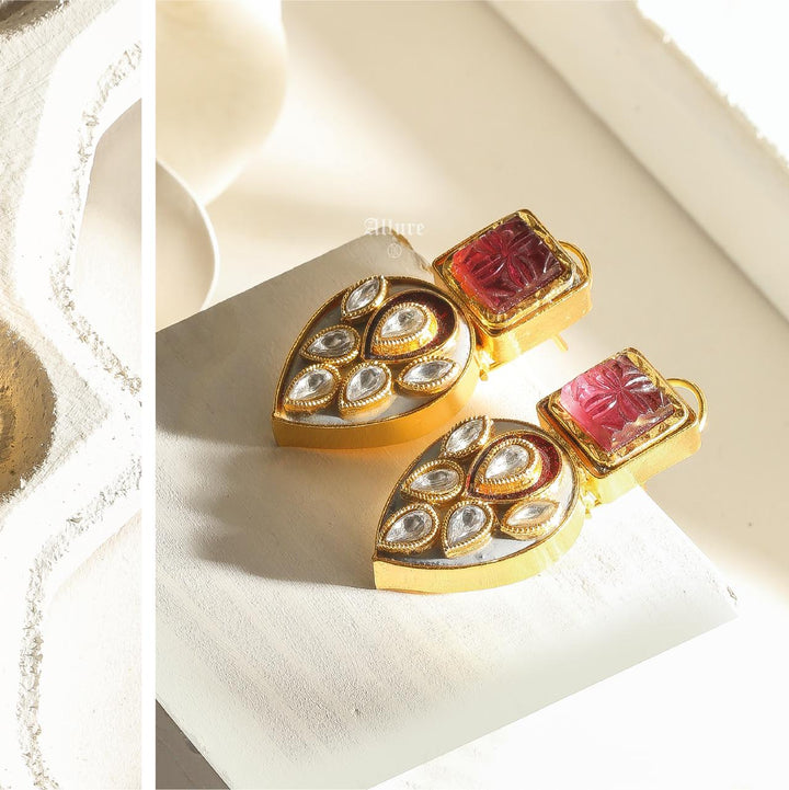 Vervin: a modern earring that exemplifies exquisite craftsmanship. The design features a square hand-carved stone top encased in a gold rim, paired with a pan-shaped enamel (meenakari) piece. Intricately set with Polki stones, these earrings offer a glamorous look. Vervin is a true testament to artistry and sophistication.