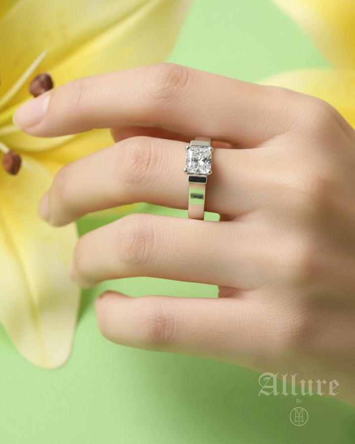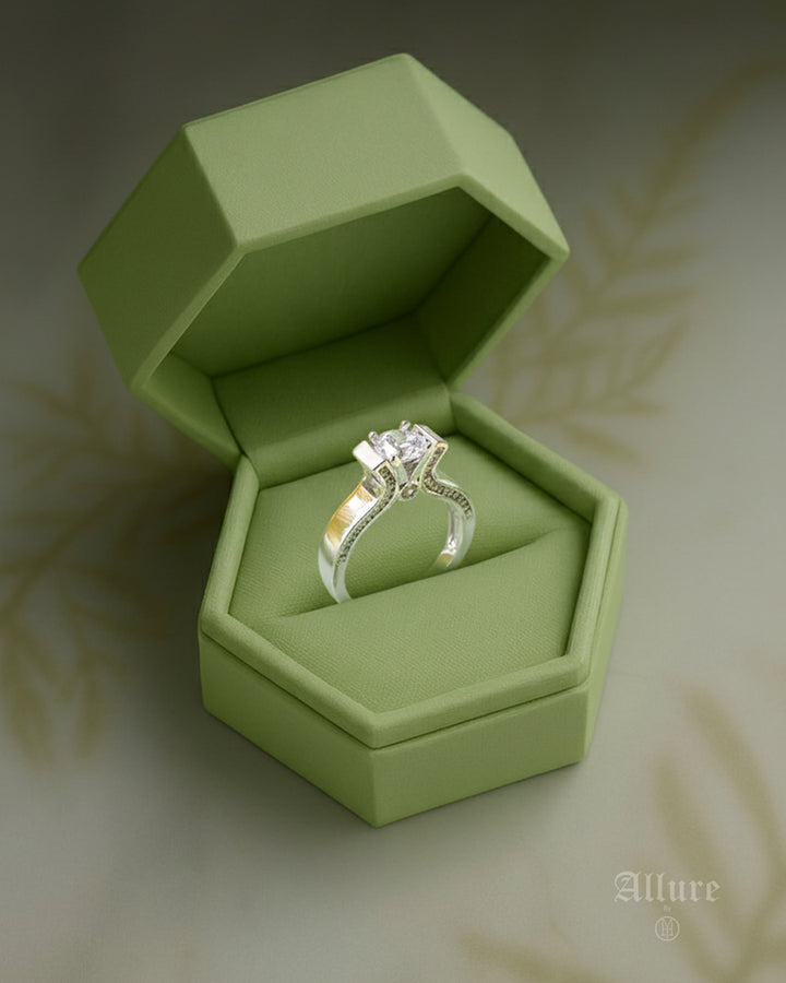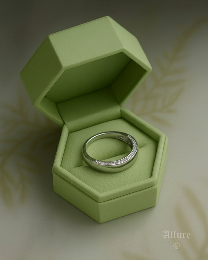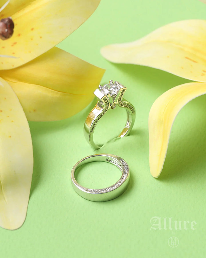 A modern bridal duo, Vows Enchant?© unites a solitaire ring with a complementary pav?© wedding band. The engagement ring features a high-set brilliant-cut stone that rises elegantly above the finger, while the slim pav?© band mirrors its sparkle and nests seamlessly beneath it. Together they create a harmonious pairing that symbolises both romance and timeless style.