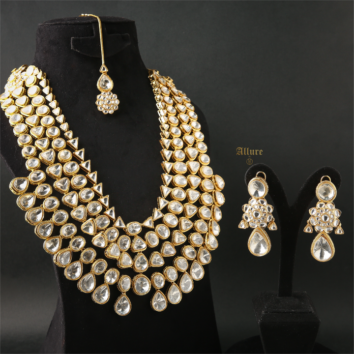 An heirloom that looks ethereal. A four tiered raank haar with polki and matching earrings that looks regal.
