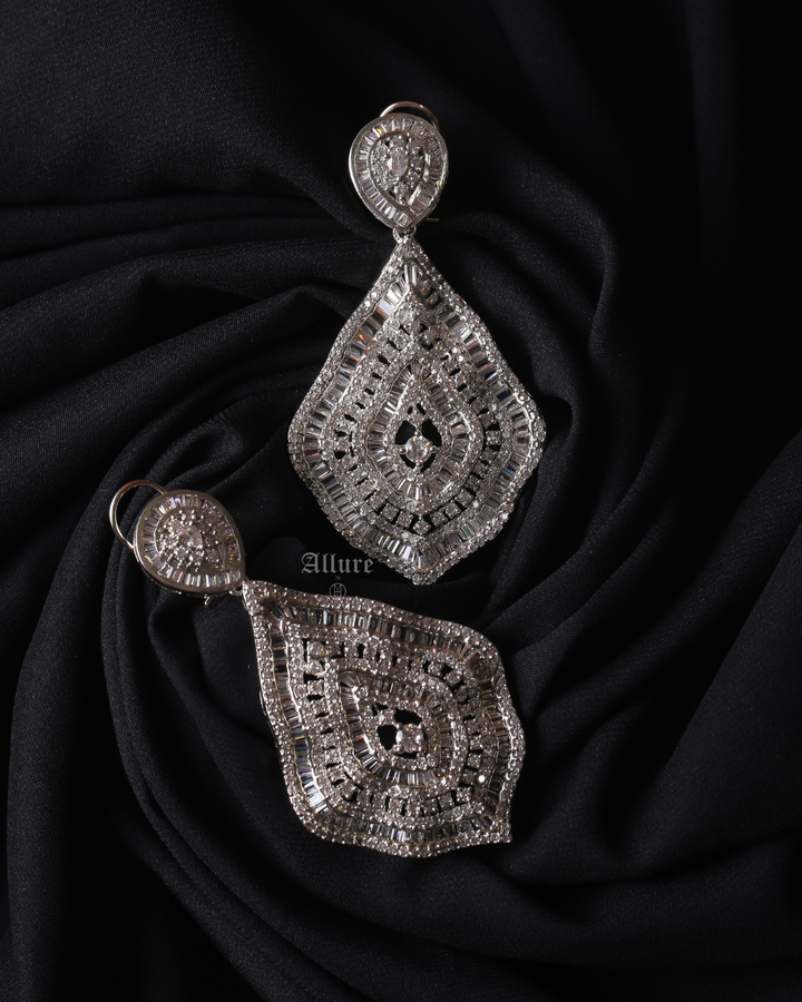 The diamond-inspired earring features a sleek circular diamond top that exudes timeless elegance, seamlessly paired with an oversized, dazzling hanging piece that captivates with every movement. Designed for those who love bold glamour, Wez radiates sophistication and luxury, making it the perfect choice for grand occasions or elevating everyday style.