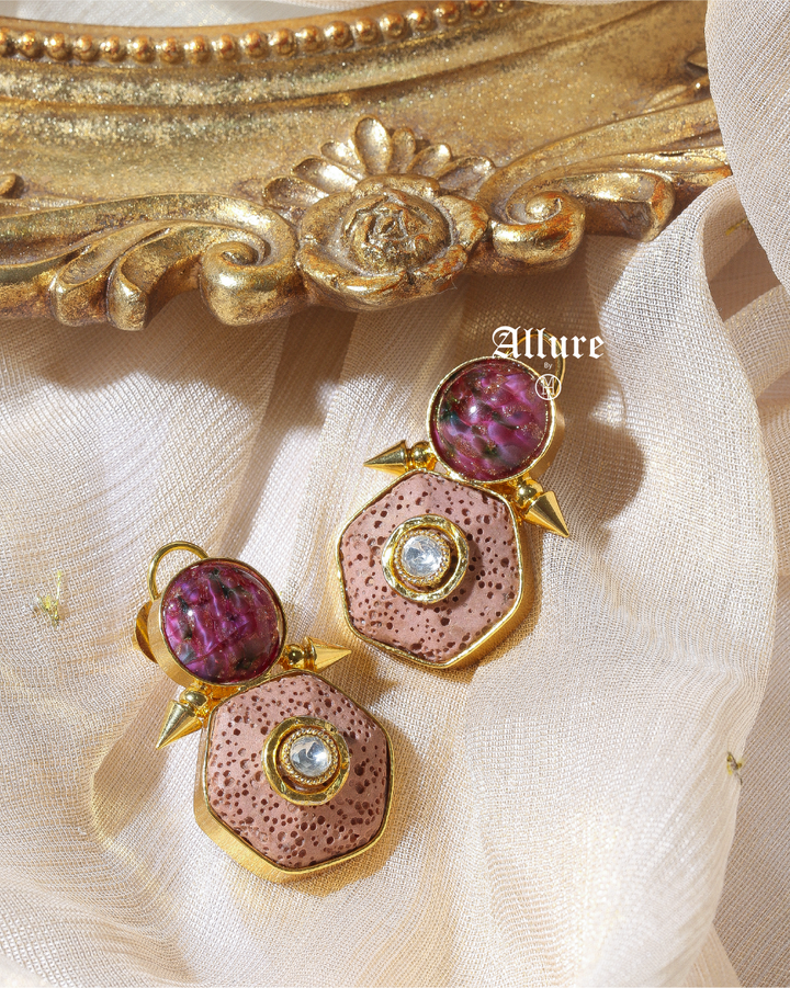 Embodying ethereal beauty, the Wraith earrings showcase a captivating mix of textures and tones. With deep-hued gemstones, intricate perforated stonework, and gold-plated accents, these earrings exude an aura of modern mystique.