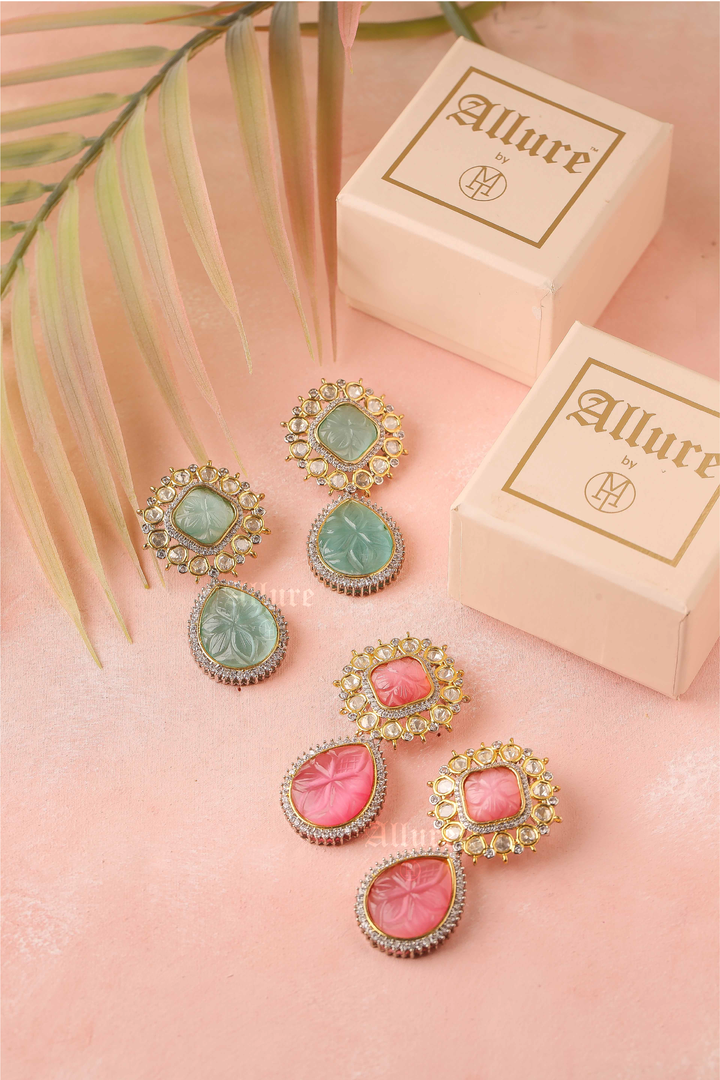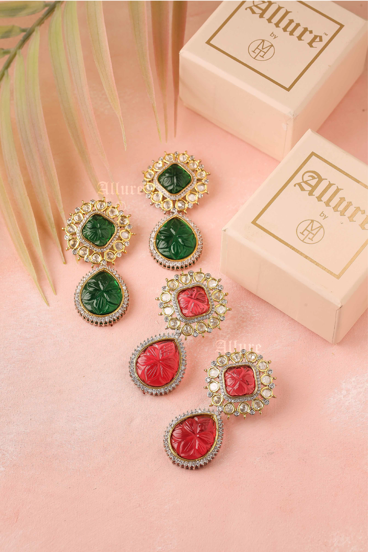 A colored handcarved stone center with Zirconia to accentuate the look. With an intricate setting of polki and hanging teardrop craved stone, the earrings are stellar.